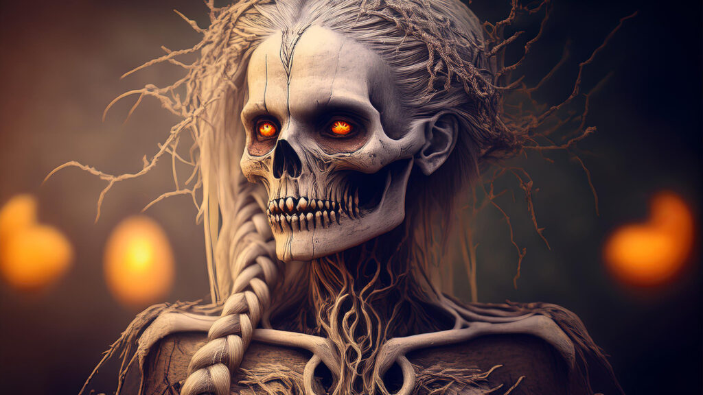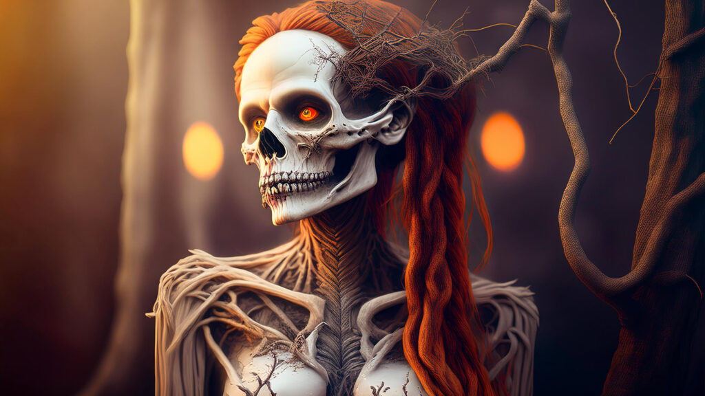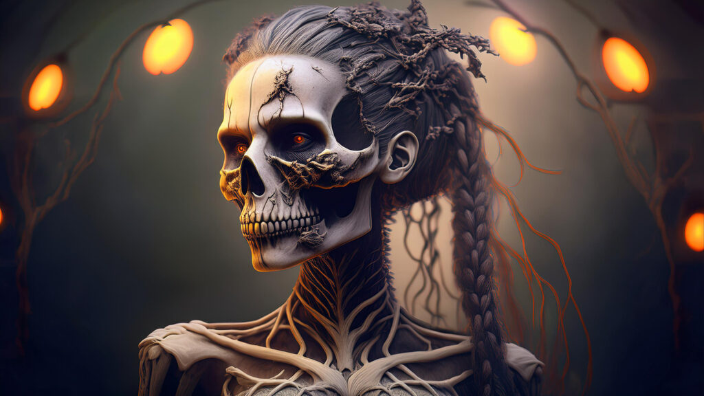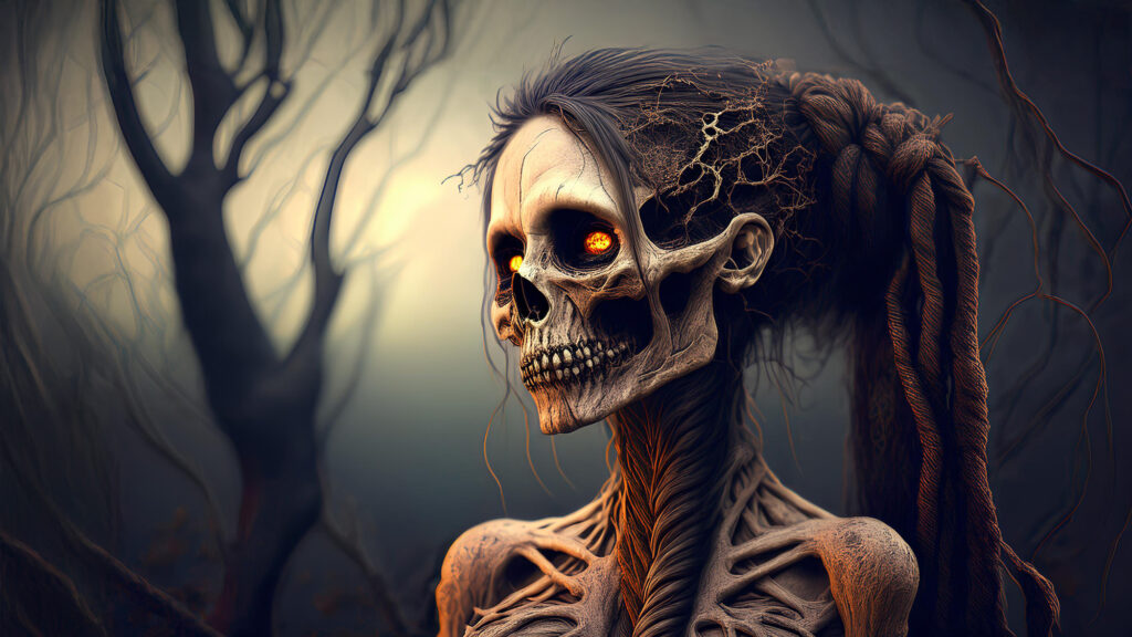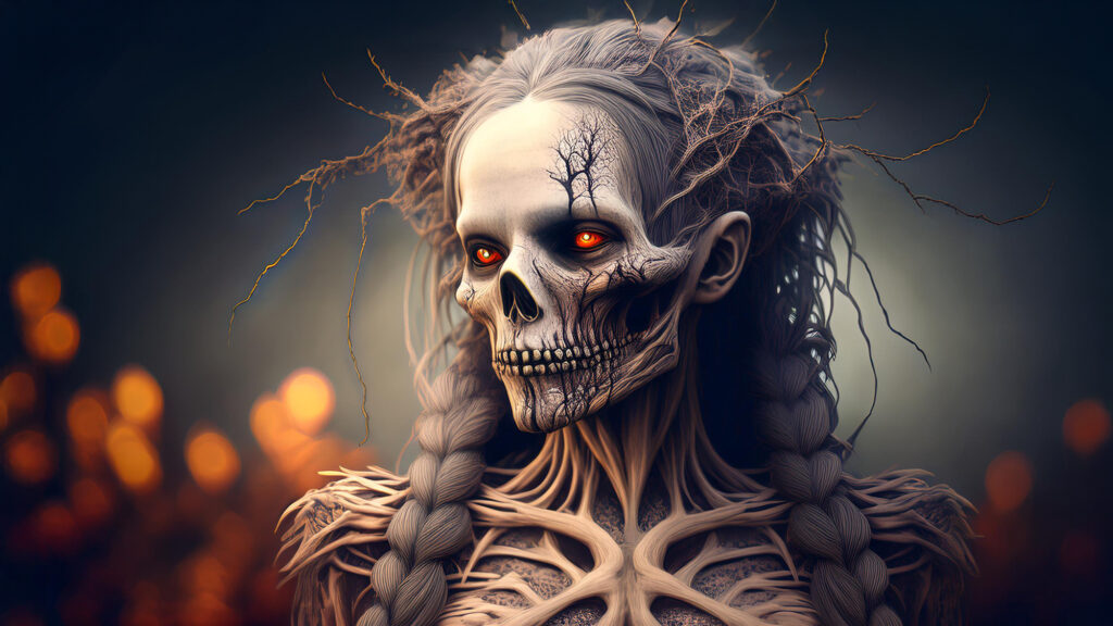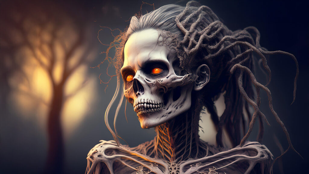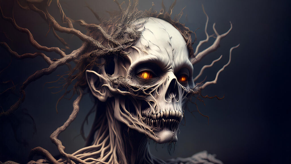 The Women are images from the same AI Dreamland as the Men and the Warriors. These busts however have a female appearance, strangely beautiful. The images are living organic beings that have evolved exoskeletons; hence, the boney skull faces. In their world these characters grown from plants that have become sentient beings. Mixing these mutants with tomatoes, garlic bulbs and some kind of green goo on their insides. Their faces, made less of flesh and more of sticks or vines, their piercing eyes cut right into you. Anybody look familiar…. ย ย ย ย