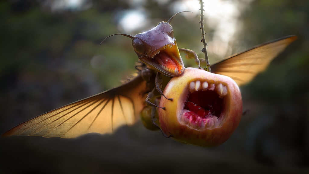Insects are just another part of the AI Fantasyland ecosystem, the same ecosystem from Scary Fruit and Vegetables or the AI Dreamland Faces, and others. The insects are, like the other monsters looking for food, hunting the young under developed or unripe fruits before they can defend themselves. Many of their victims have not grown legs yet to become mobile and cannot run away. Their fate is to remain stationary while enduring the pain of many bites, no wonder survivors are so angry.